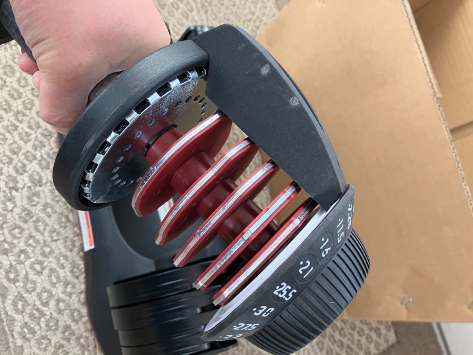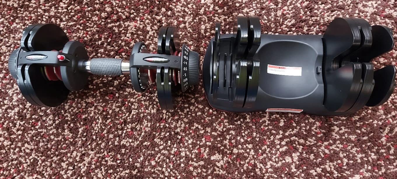 Dumbbells take some time to change weight settings—loosen bindings, remove or add discs, change bindings—but this is possible with a simple dial setting. You press the safety lever, dial in your weight, and release the lever. When you lift dumbbells, some discs are left in place so everything is secure and the weight is comfortable to use.