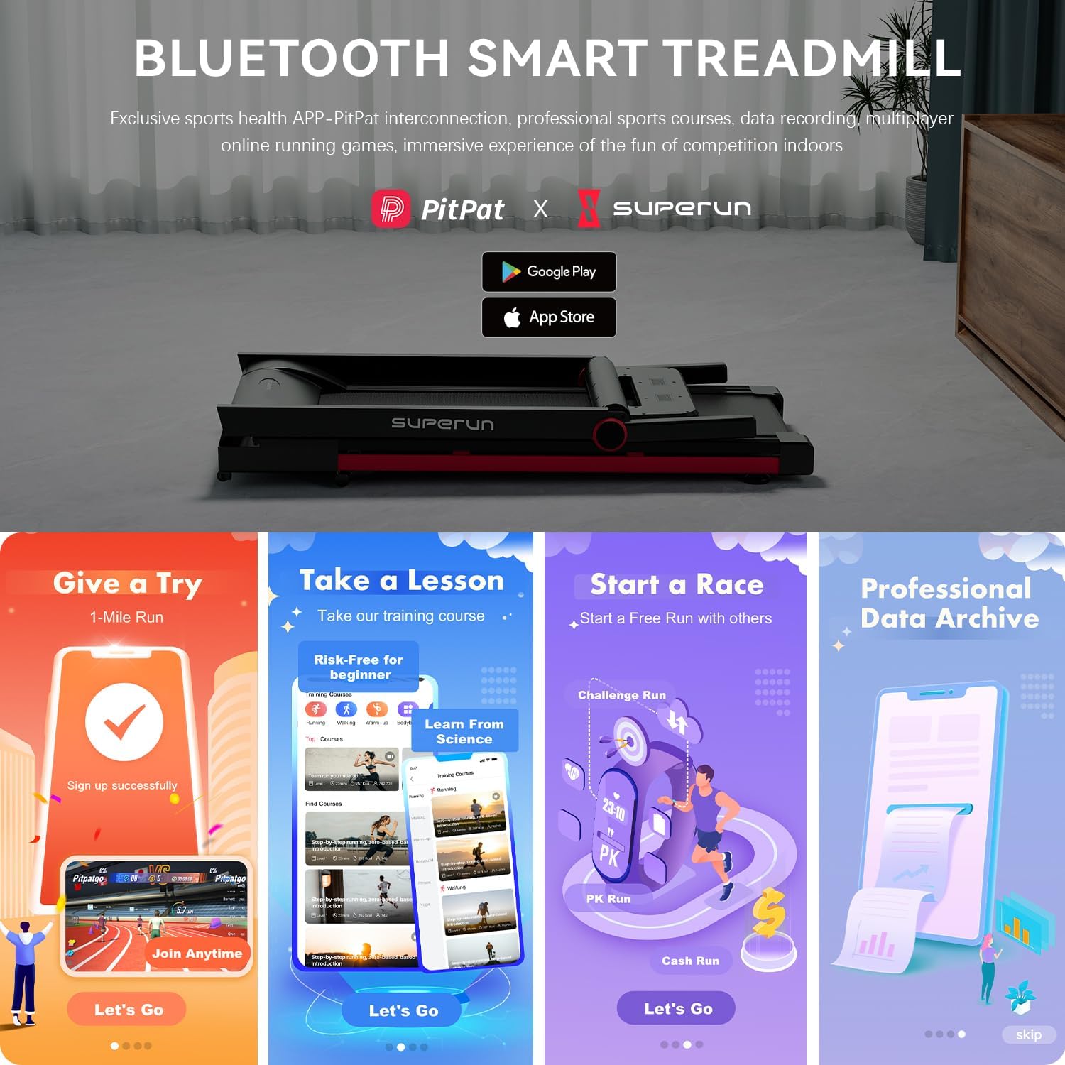 • Superun-Excel in Fitness: Superun's 3-year R&D revolutionized treadmills with new chips and APP, connecting them to High-tech wearable device. With top AI trainers and the largest online event platform. Join us to excel in fitness.