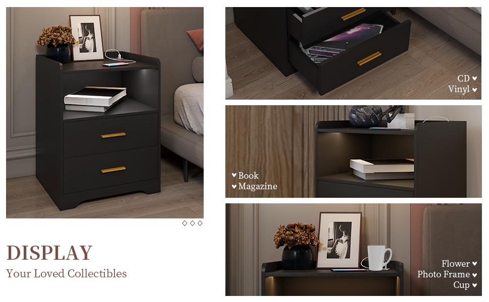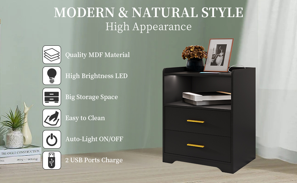 • 【Furniture】Black Nightstand with Charging Station, Night Stands with 2 Drawers, Smart Nightstand Bedside Table Led