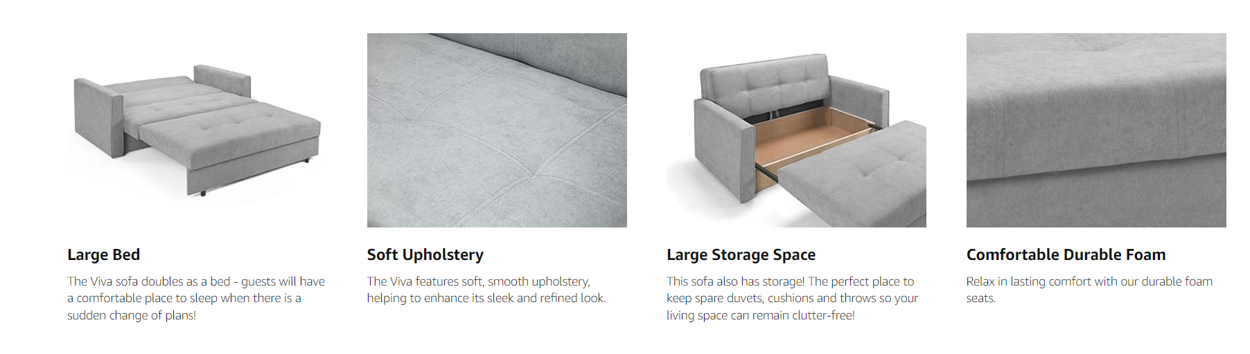- 【RANGE DESCRIPTION】The Viva sofa bed is versatile, offering storage, comfort and dual functionality. Expertly crafted, the conversion from sofa to bed and vice-versa is smooth and simple, meaning you won’t break a sweat! The Viva was designed with ease-of-use, practicality and longevity in mind, providing you with incredible, long-lasting value.