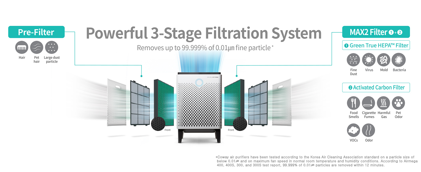 The most advanced air purifier developed by copay. Coway Airmega 300 is a powerful air purifier, that intelligently, effectively and quietly cleans the air in your home. HyperCaptive filtration system removes 99.999% of particulate matter from the air, while the accompanying pollution indicator allows you to monitor and manage air quality real-time. The Coway Airmega 300 model features smart mode (auto, sleep, eco) and real-time air quality monitoring, so you can rest assured that the Coway Airmega 300 is at work at all times. Coway Airmega 300 cleans and maintains spaces up to 1,256 sq. ft. in 30 minutes.