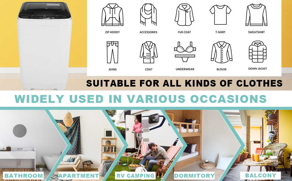 - Our practical washing machine with 10 programs is perfect for you. It has washing and dehydration functions, so you don't need to buy an additional dehydrator. You can control the water volume, mode and time of the washing machine at will. With a child lock function, the machine will not be interrupted when it is running. The side handle design is convenient to carry. The compact size is very suitable for your dormitory, apartment, apartment, RV, RV, camping.