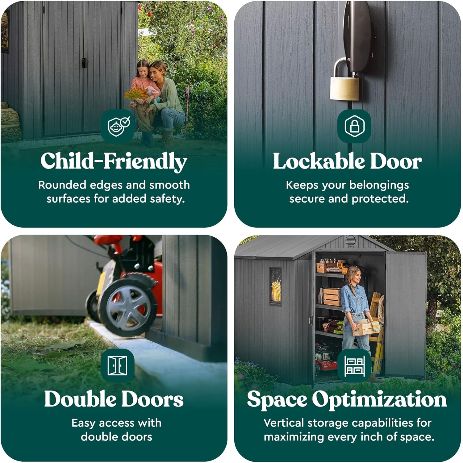 - Weatherproof and Durable: Built with wood-like Evotech material with a peak roof shape, this shed resists warp, dent, rust, rot, and peeling with reinforced metal for extra strength